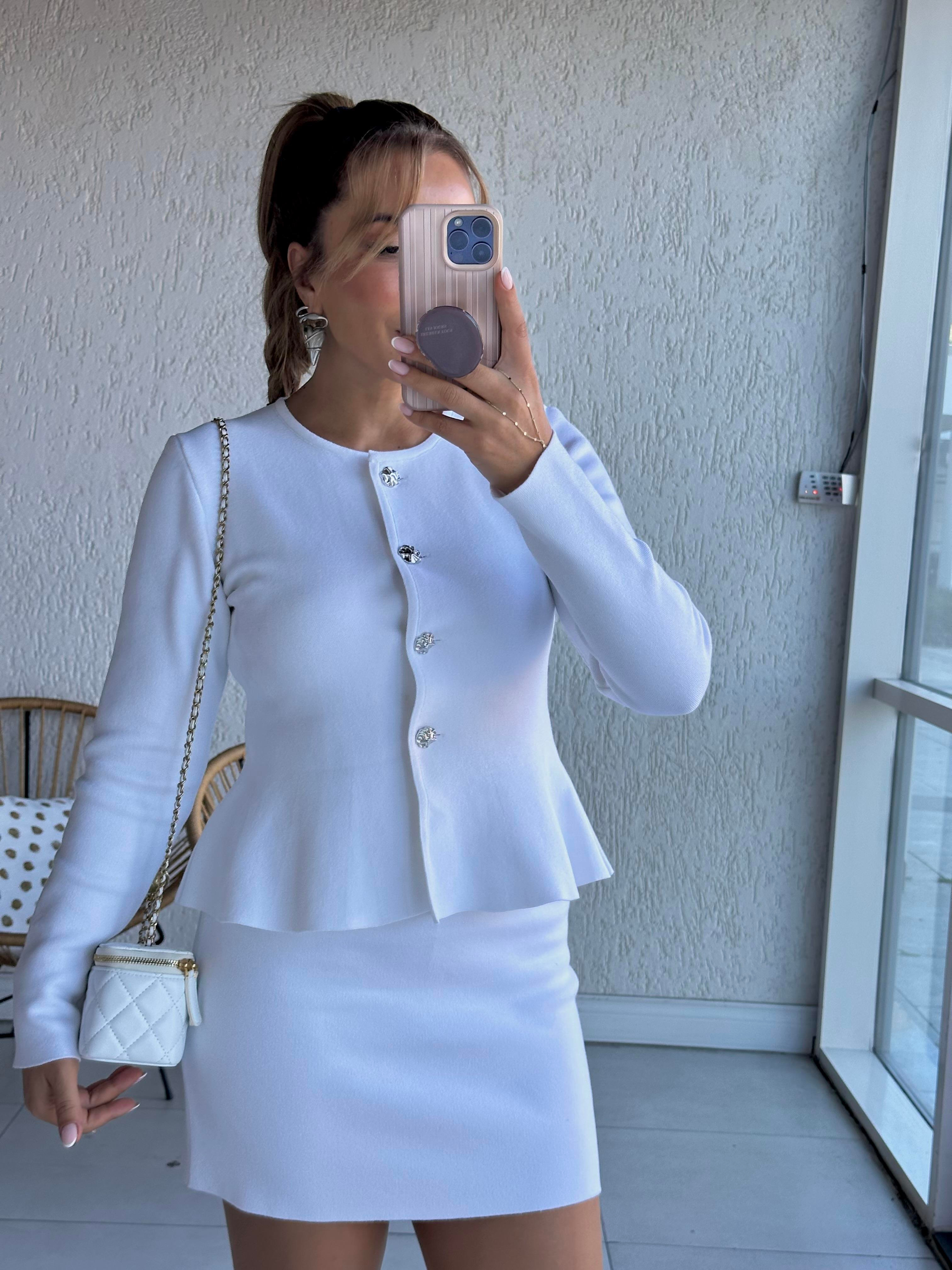 Beyaz Taş Düğmeli Premium Etek Ceket Takım