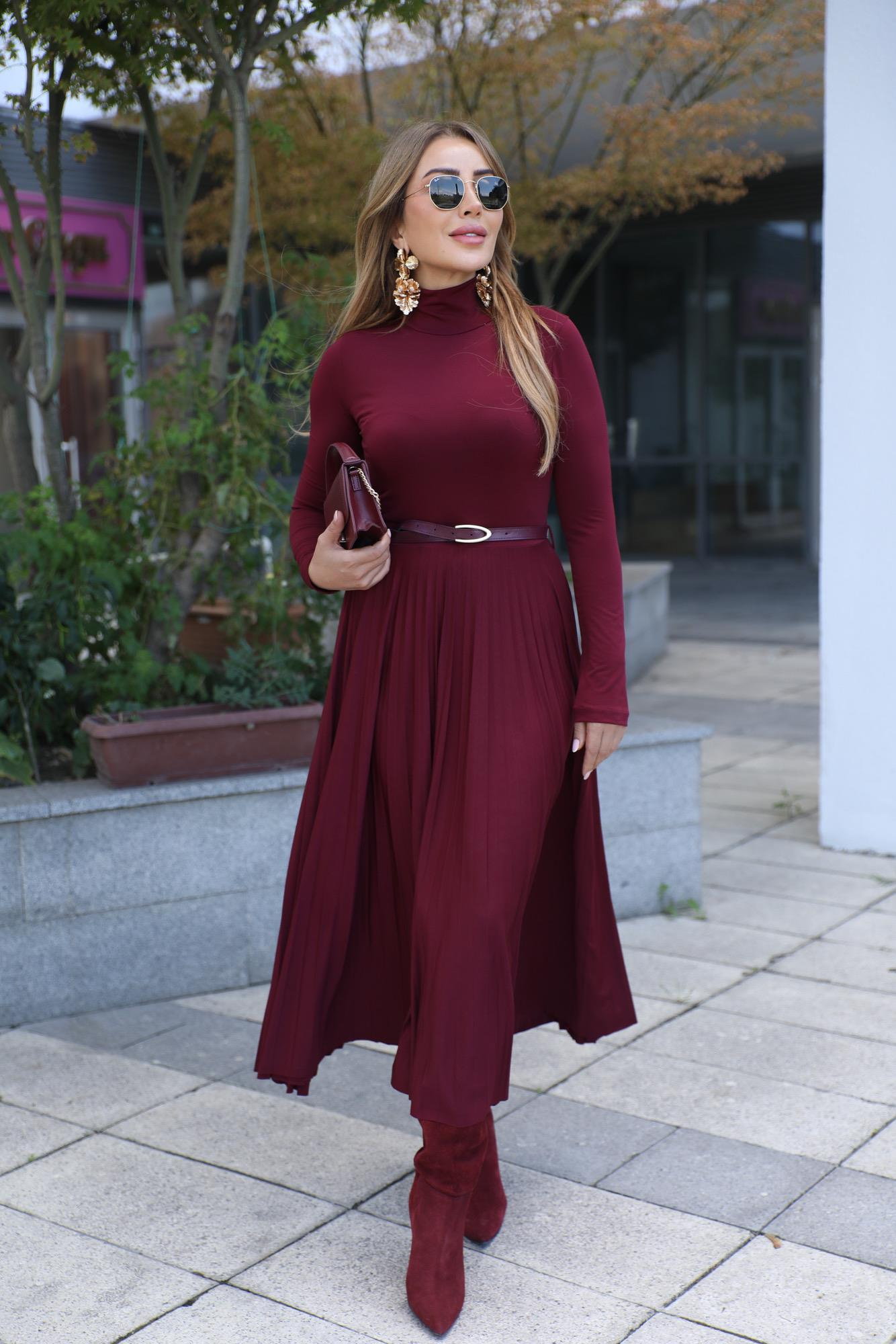Bordo Piliseli Kemerli Balıkçı Elbise