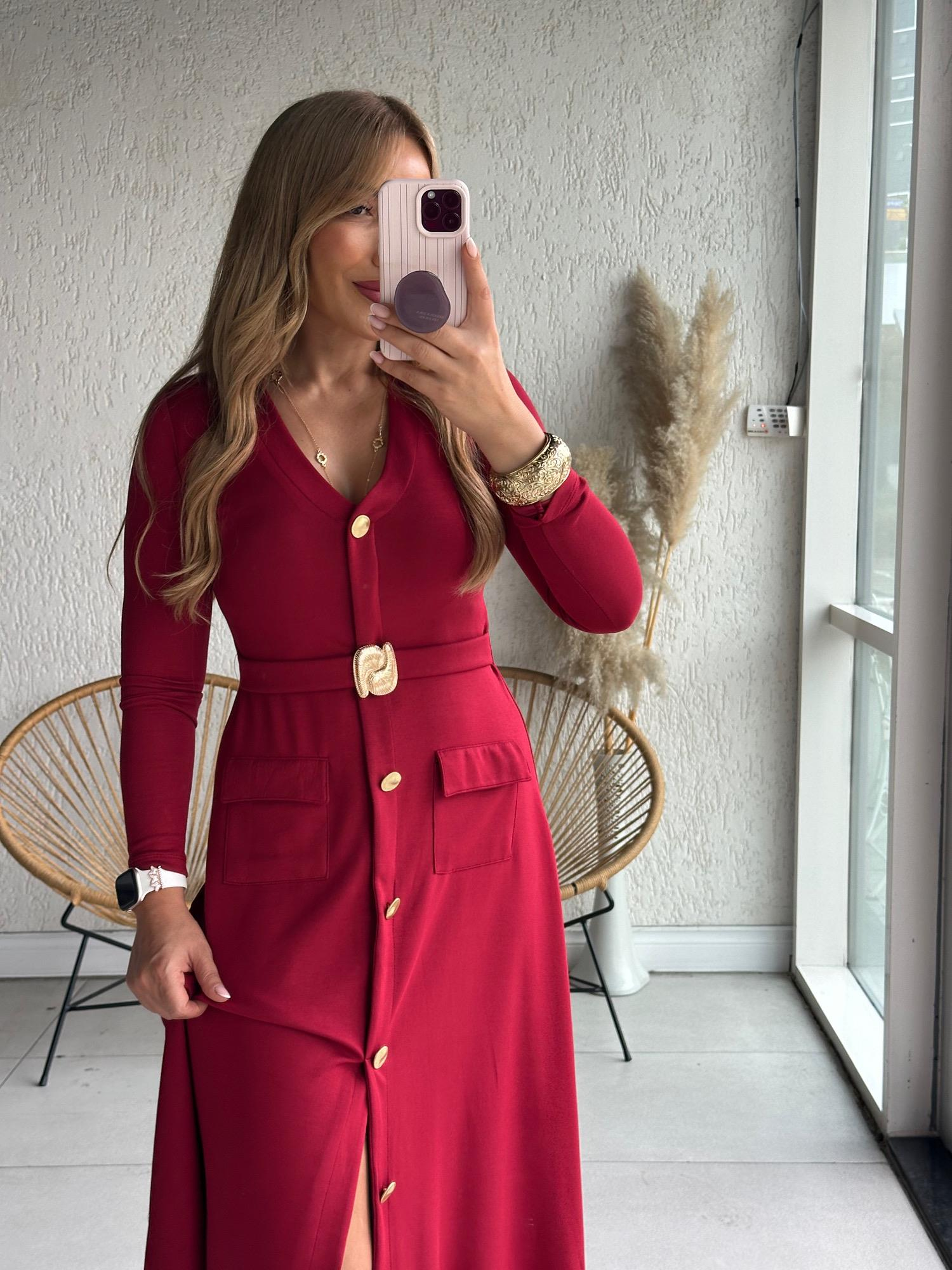 Bordo V Yaka Kemer Detaylı Elbise