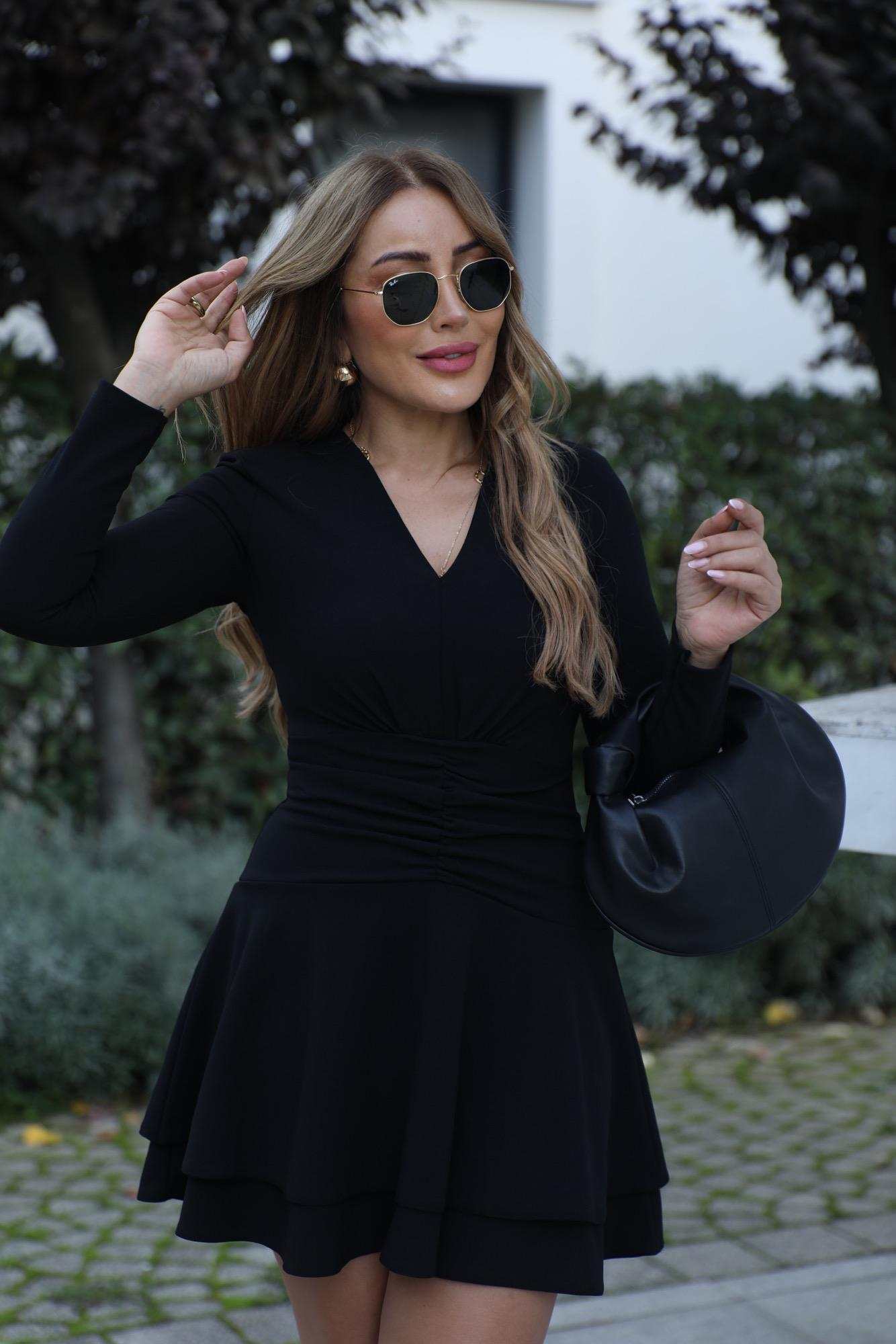 Siyah V Yaka Drapeli Kısa Elbise
