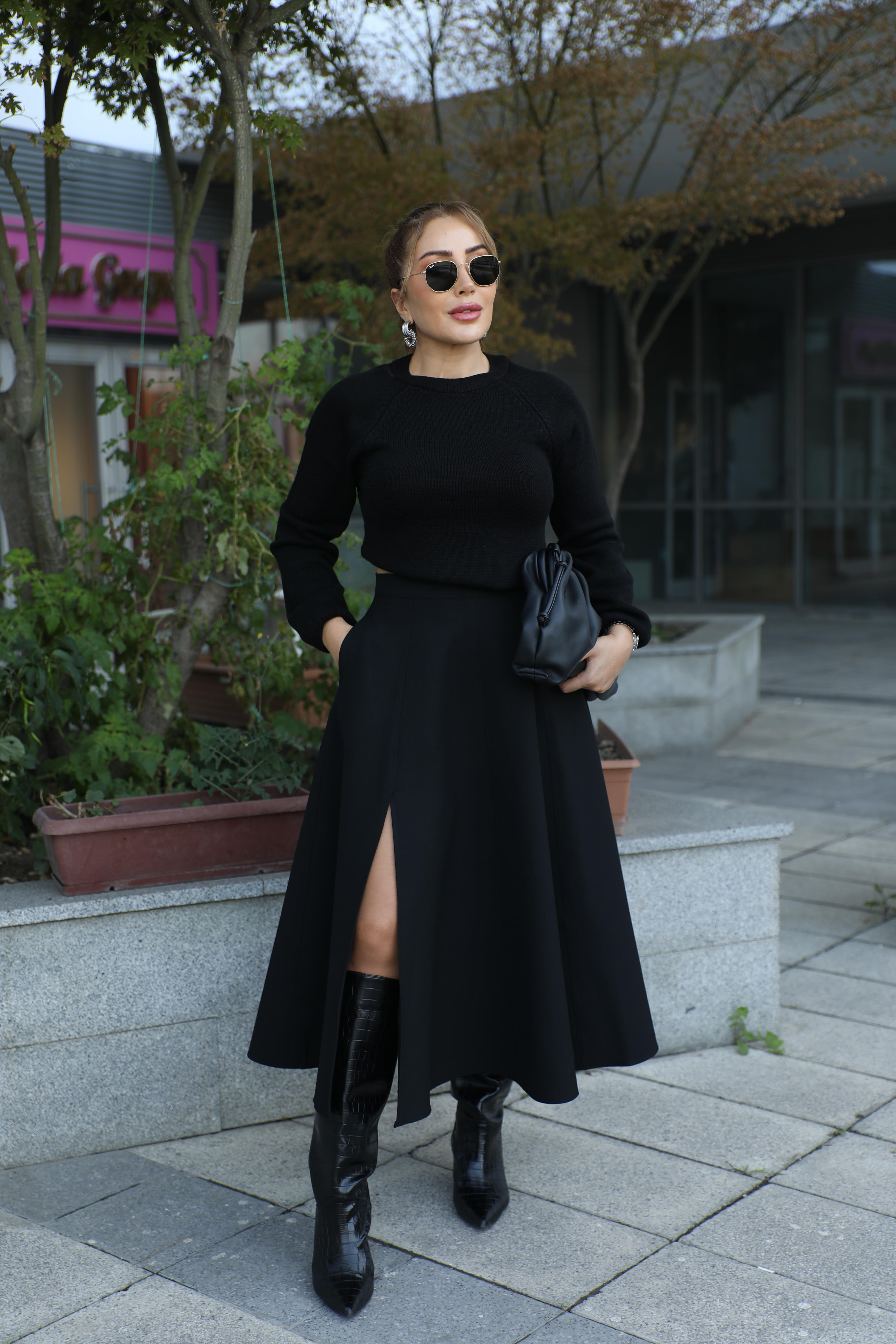 Siyah Yırtmaçlı Uzun Çan Etek